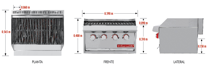 Asador a gas, con 2 parrillas reversibles, área útil frente: 0.580 m, fondo: 0.340 y 1 capa de piedra volcánica refractaria. 2 parrillas reversibles de hierro fundido, área útil de: frente: 0.290 m, fondo: 0.340 m cada una.
