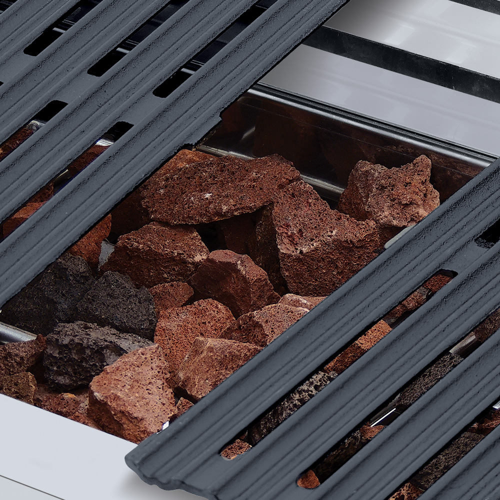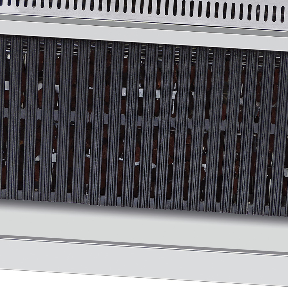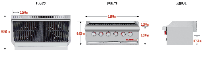 Asador a gas, con 3 parrillas reversibles área útil frente: 0.870 m, fondo: 0.340 m y 1 capa de piedra volcánica refractaria. 3 parrillas reversibles de hierro fundido, área útil de: frente: 0.290 m, fondo: 0.340 m cada una.