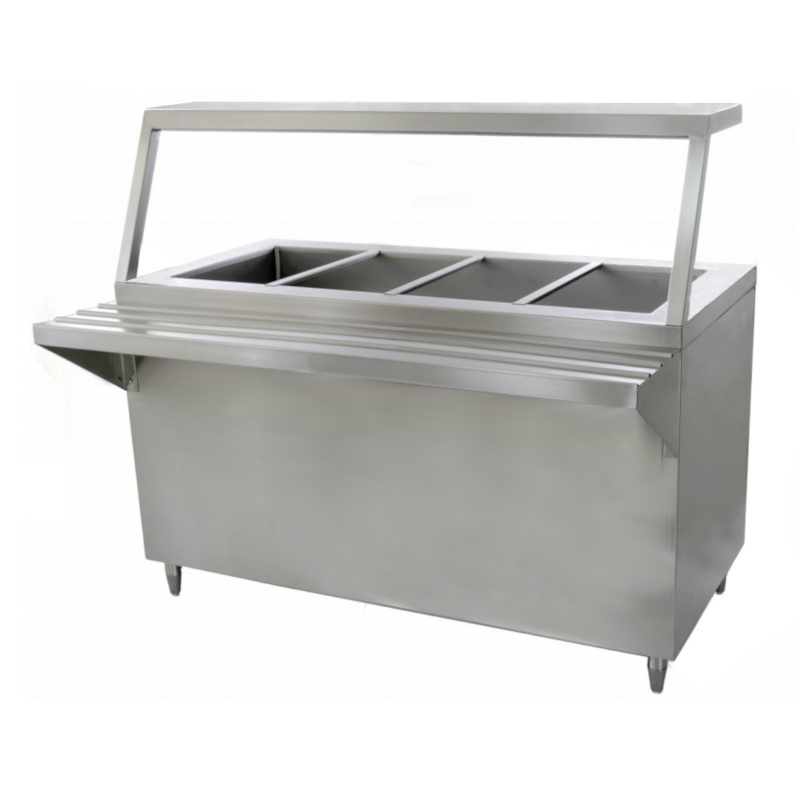 BAÑO MARIA FABRICADO EN ACERO INOXIDABLE CUBIERTA Y TINA CALIBRE 18 FRENTE, COSTADOS, PISO,FALDON, REPISA CONTRA ESTORNUDOS Y REPISA DE DESLIZAMIENTOS DE CHAROLAS EN CALIBRE 20, CONTRATINA EN LAMINA GALVANIZADA CALIBRE 20, AISLADA CON FIBRA DE VIDRIO LLEVA QUEMADORES CIRCULARES DE ALUMINIO Y ROMPE FLAMAS EN C.R. MONTA SOBRE PATAS Y REGATONES NIVELADORES. NO INCLUYE NI CRISTALES NI INSERTOS