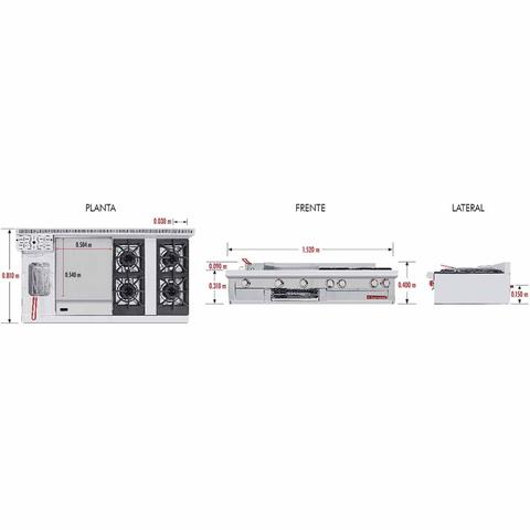 Estufa a gas, con 4 quemadores abiertos, 1 plancha, 1 gratinador y 1 freidora 3 lt. Freidora con tina en acero inoxidable tipo 304, esquinas sanitarias, capacidad para 3 litros de aceite, medida interior: