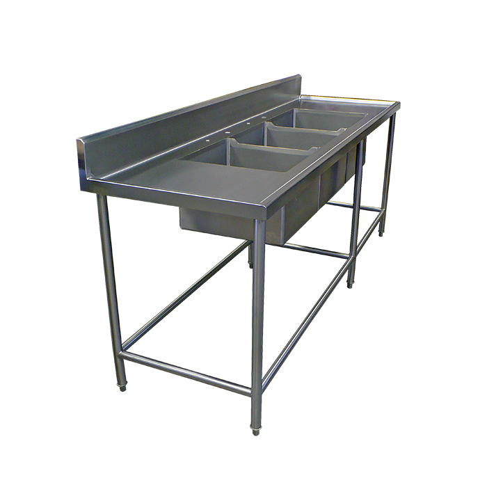 FABRICADO EN ACERO INOXIDABLE , CUBIERTA Y TARJAS EN CALIBRE 18, 3 TARJAS DE 0.60 X 0.60 X 0.40, MONTA SOBRE ESTRUCTURA TUBULAR DE ACERO INOXIDABLE, PATAS DE 1 1/2″ Y PEINAZOS DE1 ‘/» CON REGATONES NIVELADORES. (TARJAS IZQUIERDAS, DERECHAS Y CENTRALES)NO INCLUYE HERRAJES
