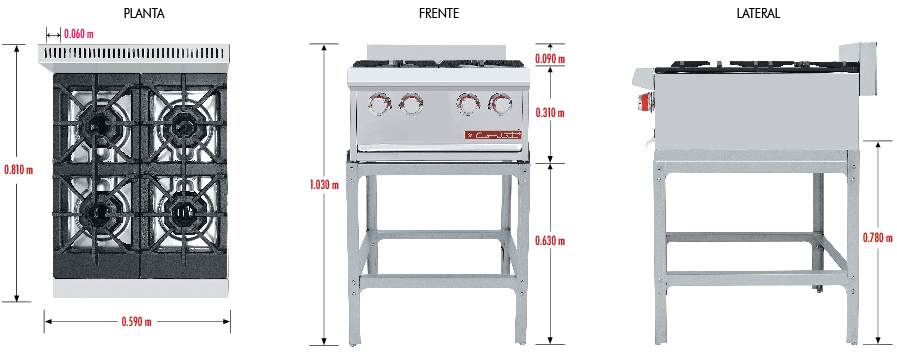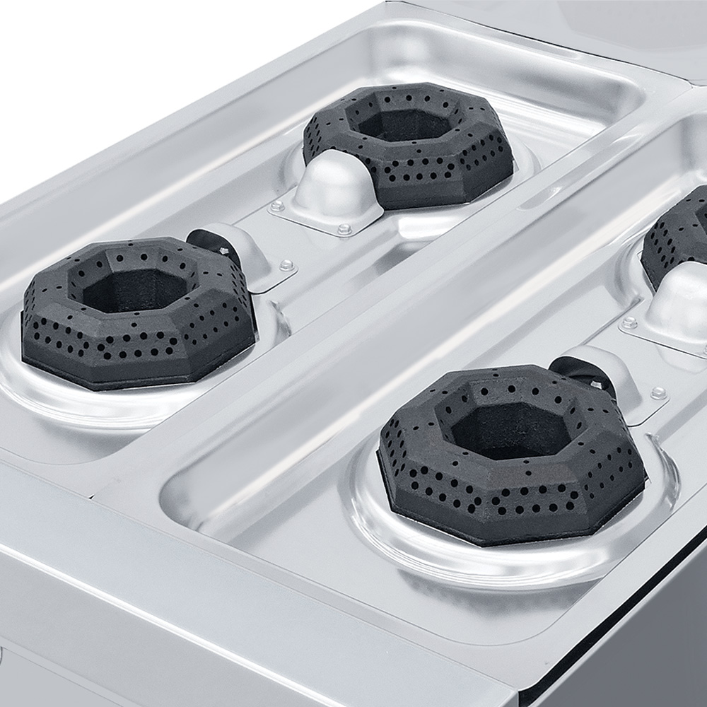 Parrilla de 4 quemadores con 2 parrillas superiores montadas sobre cubierta semi-sellada. 4 quemadores octagonales con tapa desmontable.