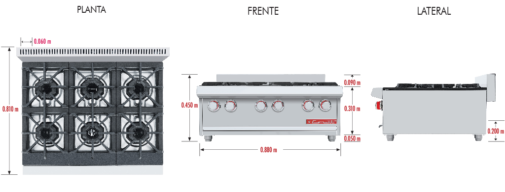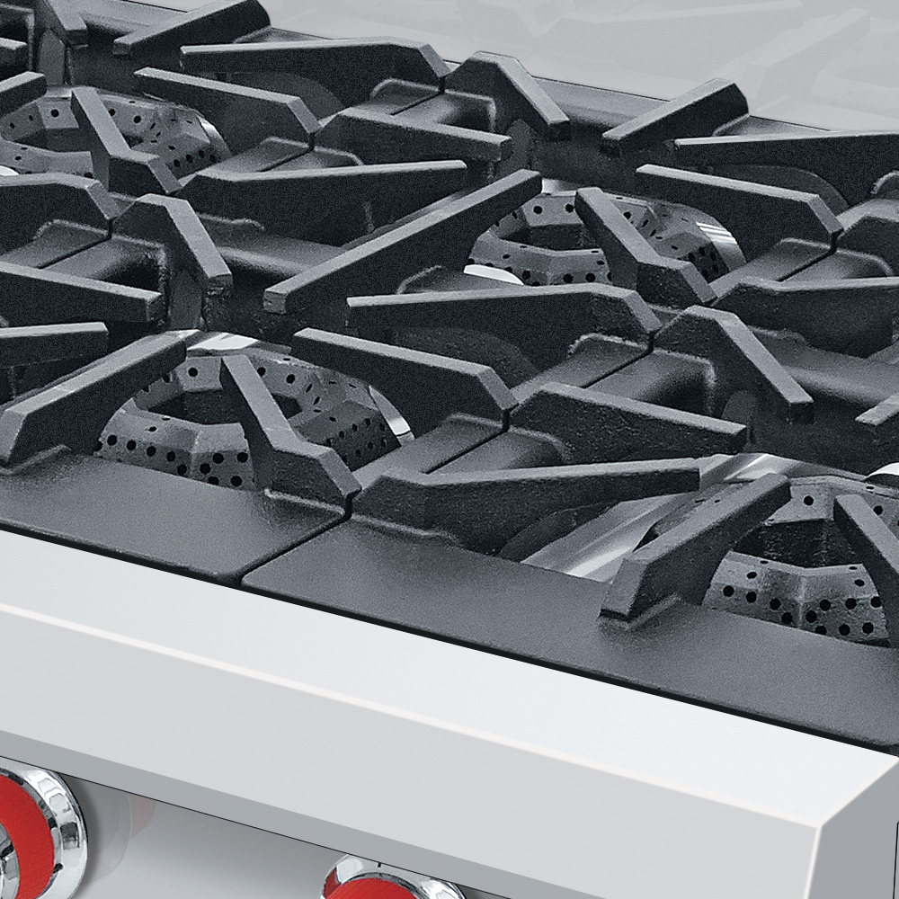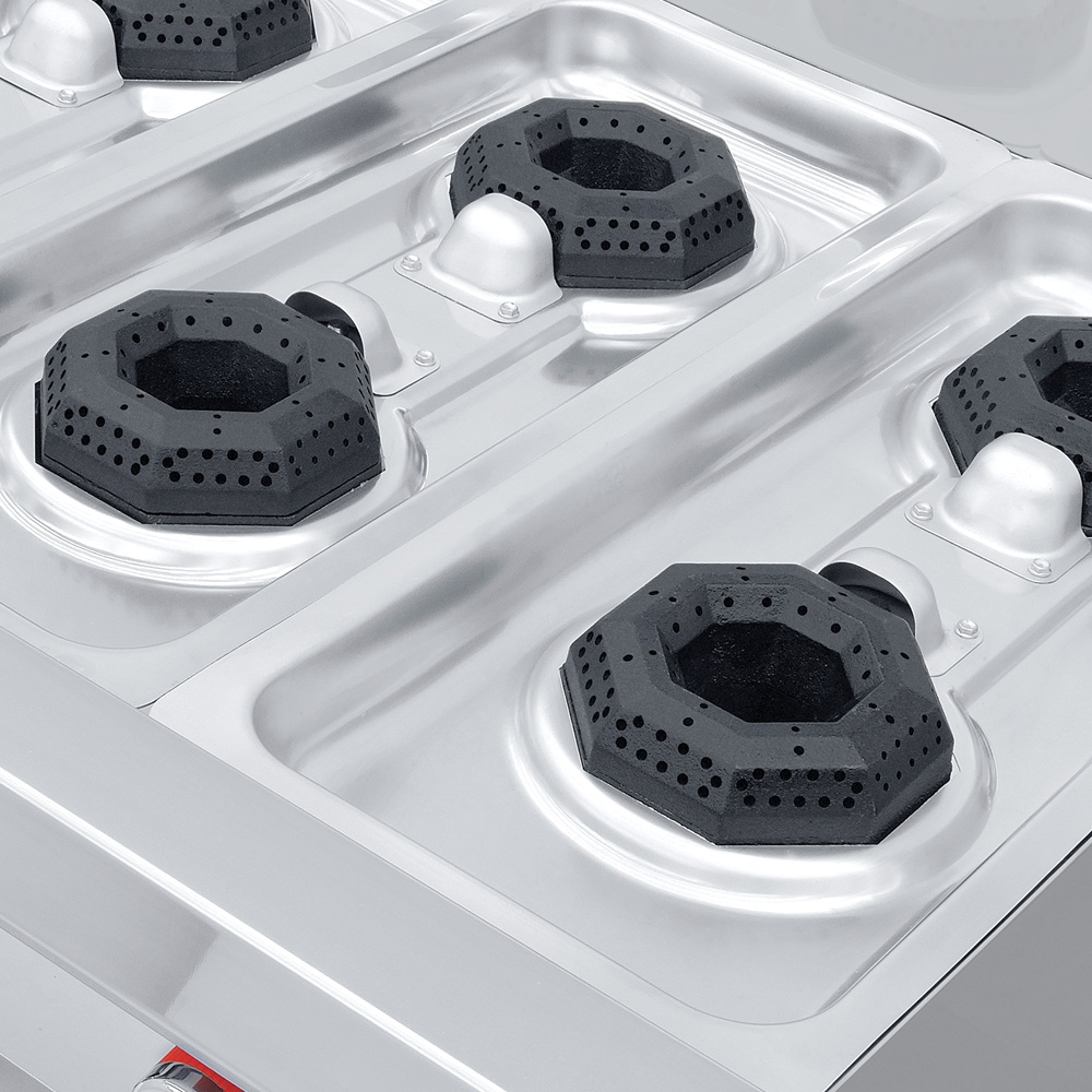Parrilla de 6 quemadores con 3 parrillas montadas sobre cubierta semi-sellada. 6 quemadores octagonales con tapa desmontable.