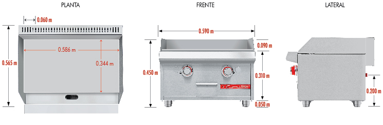 Plancha a gas, con 2 quemadores tubulares, placa de 3/4″ de espesor, área útil: frente: 0.586 m, fondo: 0.344 m. Plancha de cold rolled steel de 3/4″ de espesor con un área útil de: frente: 0.586 m, fondo: 0.344 m.
