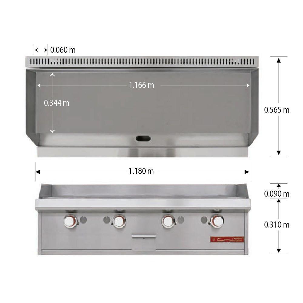 Plancha a gas, con 4 quemadores tubulares, placa de 3/4″ de espesor, área útil: frente: 1.166 m, fondo: 0.344 m. Plancha de cold rolled steel de 3/4″ de espesor con un área útil de: frente: 1.166 m, fondo: 0.344 m.