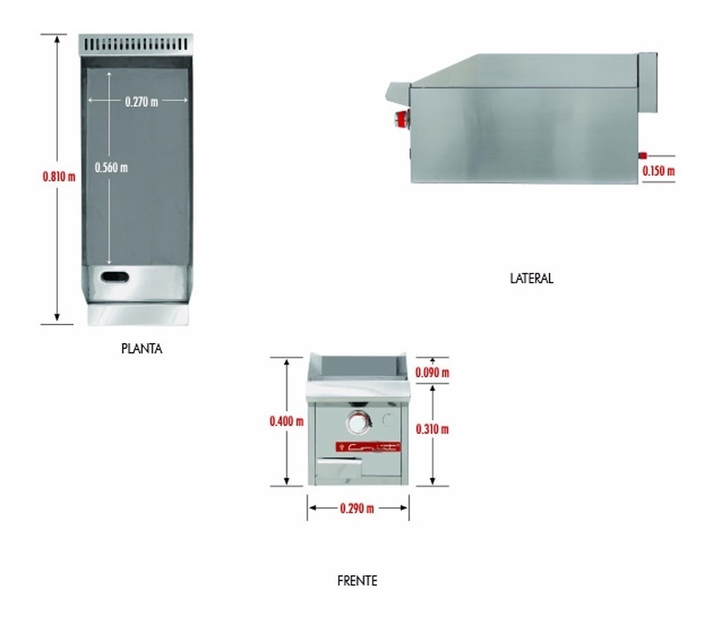 Plancha de cold rolled steel con 1 quemador en «u». Plancha cold rolled steel de 3/4″ de espesor con área útil de: frente: 0.288 m, fondo: 0.560 m.