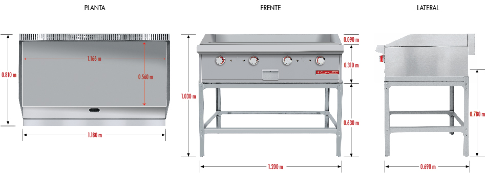 Plancha de cold rolled steel con 4 quemador en «u». Plancha cold rolled steel de 3/4″ de espesor con un área útil de: frente: 1.166 m, fondo: 0.560 m.